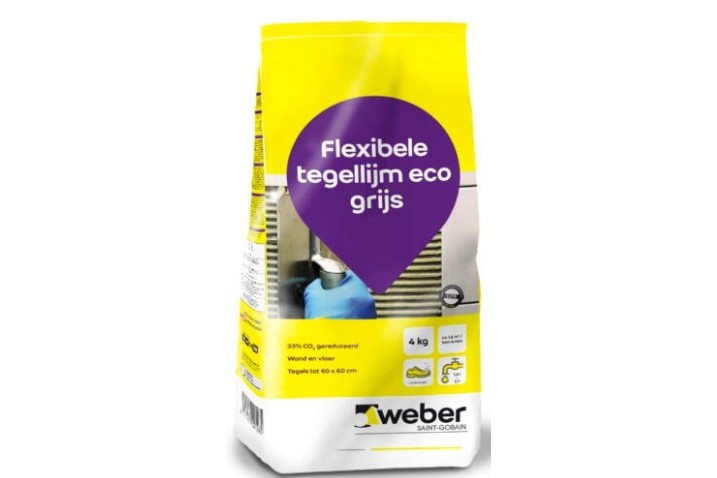 De grijze Eco flexibele tegellijm van Weber is een milieuvriendelijke, stofarme lijm voor het lijmen van wand- en vloertegels