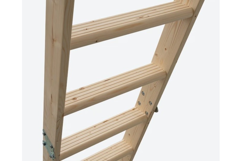 sparrenhout, met antislip treden voor extra veiligheid. Het heeft een hoogwaardige afwerking met een witte valdeur. De